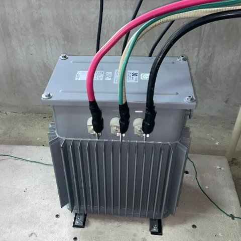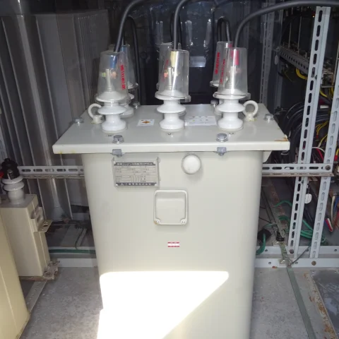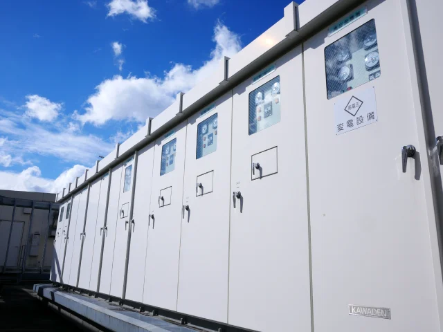 高圧の電気を低圧に変換します。変圧器は30年前の機器と比べると、損失が改善され、省エネおよびCO2削減効果が期待されます。