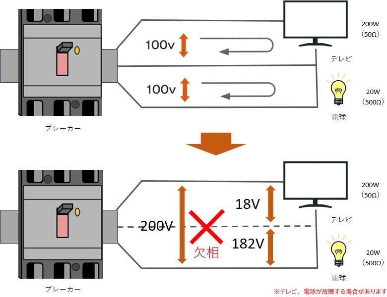 中性線欠相が起きると、ご家庭内にある照明器具やテレビ、冷蔵庫、洗濯機などの家電製品に100V以上の電圧(過電圧)が加わり故障します。ご家庭内の家電製品ほとんどが故障し、数十万円の被害となる例もあります。(一般的に中性線欠相による故障はメーカーの保証対象外として有償修理となります。)